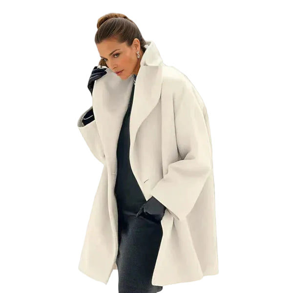 Kåpen har en løstsittende silhuett med brede slag og en avslappet passform, noe som skaper et elegant, men uanstrengt utseende. Takket være det myke stoffet av høy kvalitet føles kåpen komfortabel og tilbyr akkurat den rette balansen mellom varme og stil – perfekt for overgangssesongen.
