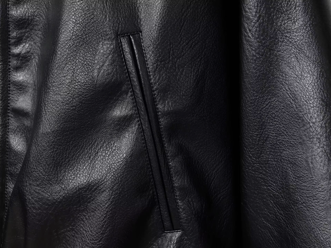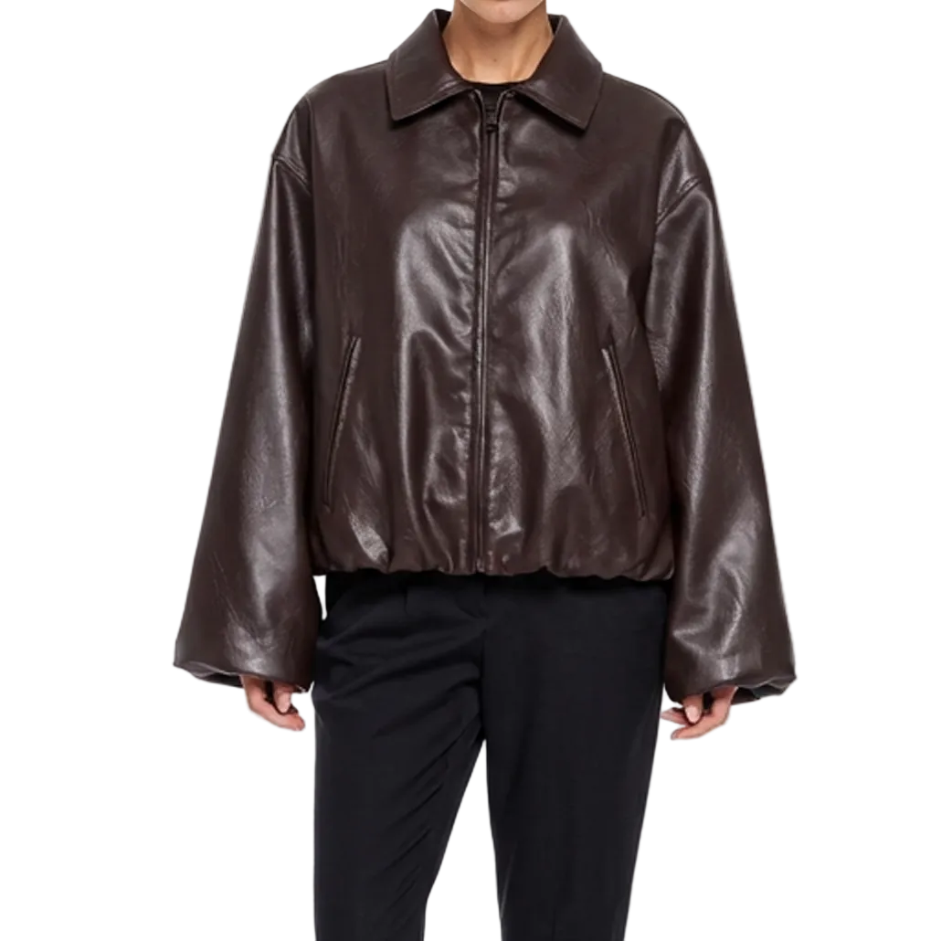 Denne trendy korte jakken med skinnlook er et must-have for et moderne og edgy antrekk. Den litt overdimensjonerte passformen, kombinert med den elastiske kanten, skaper en kul, men feminin silhuett. Takket være det minimalistiske designet er denne jakken uendelig allsidig, fra avslappet til elegant.