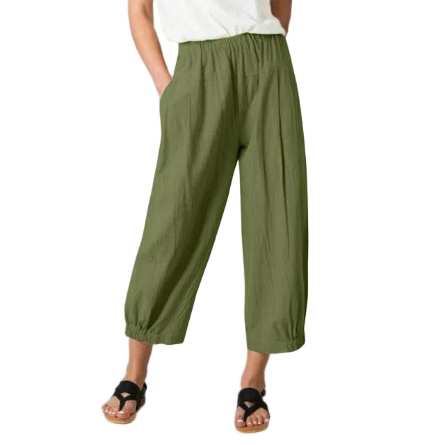 Gå for en uanstrengt stil med disse luftige buksene i en vakker olivengrønn fargetone. Den avslappede passformen og det myke, pustende stoffet gjør disse buksene perfekte for varme dager, uformelle antrekk og avslappede øyeblikk.