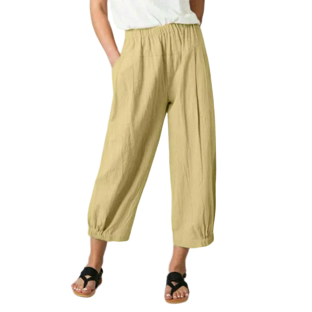 Den elastiske linningen sikrer en komfortabel og fleksibel passform, mens de vide bena med en diskré elastisk kant skaper en leken, moderne silhuett. Den naturlige fargen gir et rolig, trendy utseende og er enkel å kombinere med både lyse basisplagg og jordfarger.