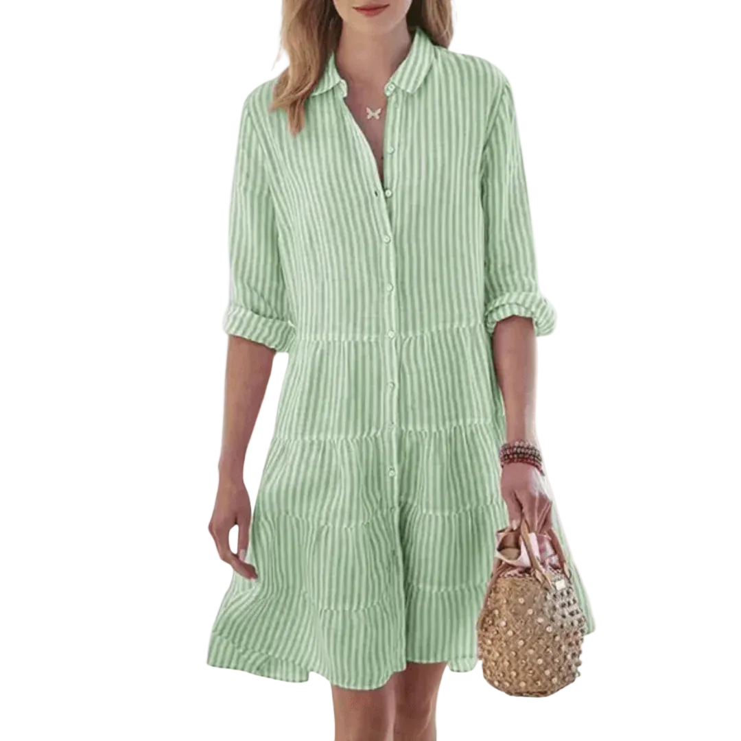 Denne stilige lysegrønne skjortekjolen med diskrete hvite striper er det perfekte valget for et uanstrengt sommerantrekk. Den kombinerer det klassiske utseendet til en skjorte med komforten til en løstsittende kjole – ideell for varme dager og avslappede, elegante antrekk.