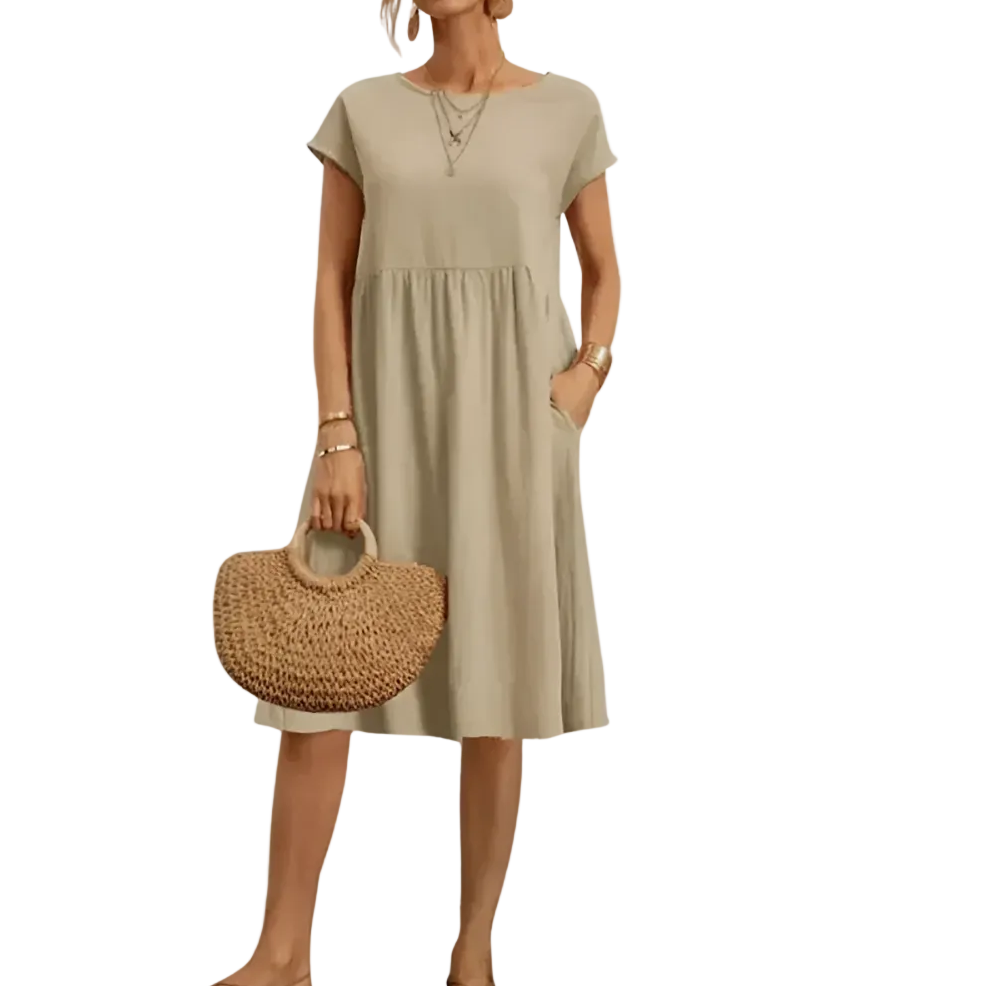 Denne elegante midikjolen er den perfekte kombinasjonen av komfort og enkelhet. Den har en rett, avslappet passform med en lett samlet midje, noe som skaper en flatterende og luftig silhuett. De korte ermene og den runde halsen gir kjolen et minimalistisk utseende som er enkelt å style.