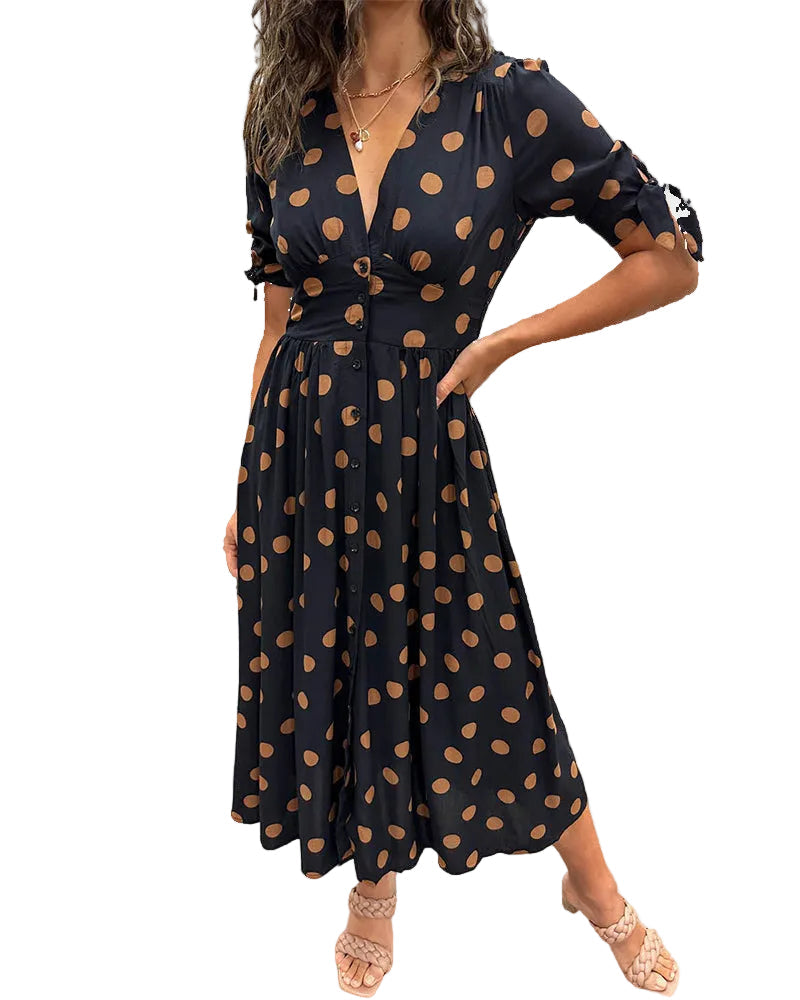 Denne elegante, svarte midikjolen med et lekent polkadot-trykk er et must i enhver garderobe. Den klassiske kombinasjonen av svarte og varme brune polkadotter skaper et tidløst og elegant utseende som aldri går av moten.