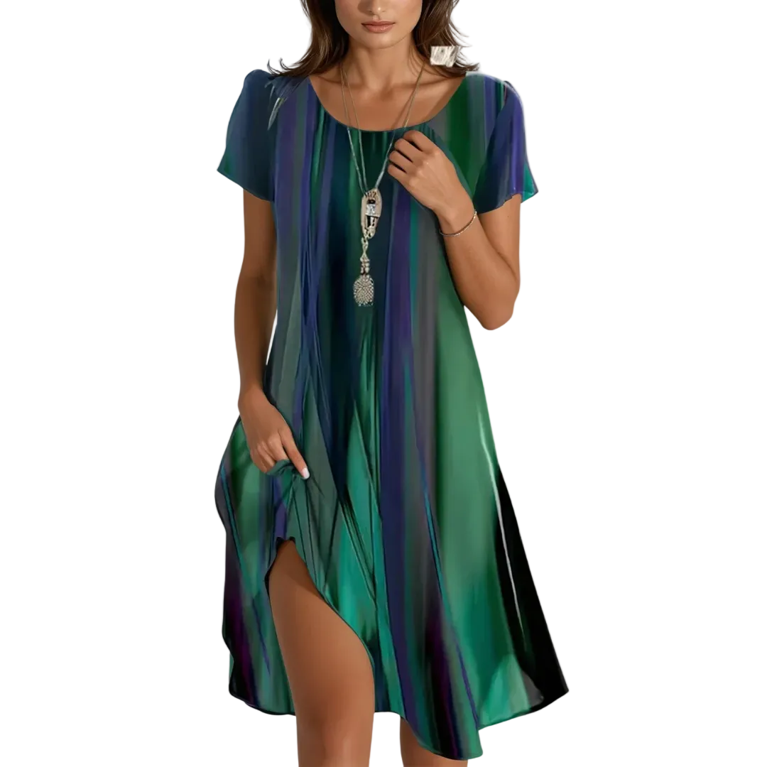 Denne stilige midikjolen kombinerer komfort med eleganse. Det vertikale stripemønsteret i raffinerte grønne nyanser med subtile kontrastfarger skaper en flatterende effekt og gir kjolen et moderne, elegant utseende. Den runde halsen og de korte ermene gjør designet tidløst og allsidig.