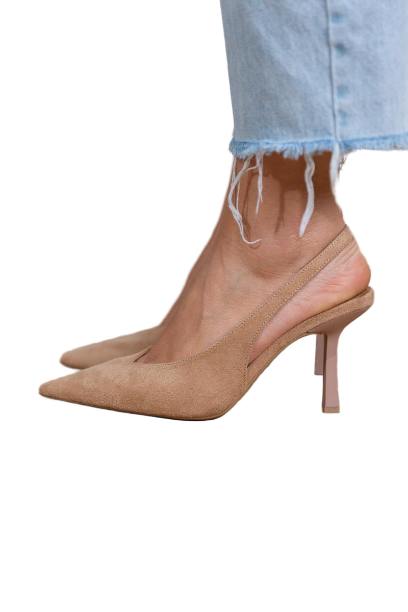 Gi ethvert antrekk en stilig oppgradering med disse elegante beige slingback-pumpskoene. Den raffinerte spisse tåen og den slanke hælen skaper et elegant utseende, mens den åpne hældesignen gjør skoen lett, moderne og komfortabel. Disse pumpsene er perfekte for kvinner som setter pris på subtil luksus og uanstrengt eleganse.