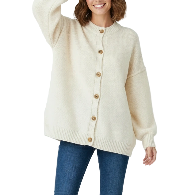 Denne oversized cardiganen er et absolutt must-have for alle som elsker myke, komfortable og tidløse strikkeplagg. Cardiganen er laget av et varmt, luftig strikket stoff som føles deilig og er perfekt for høsten, vinteren og kjølige vårdager.
