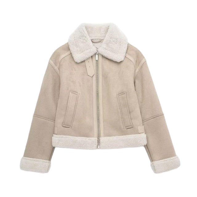 Omfavn varme og stil med denne vakre beige teddy-aviatorjakken – det perfekte vinter-must-have for enhver moteelsker. Laget av et mykt, semsket skinnlignende stoff med et luftig borgfôr, føles den herlig komfortabel. Den brede kragen og mansjettene er ferdig med det samme varme teddystoffet, noe som gir jakken et luksuriøst og koselig utseende.