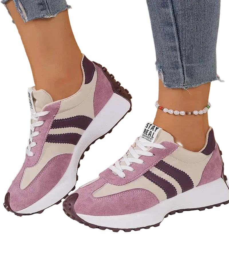 Disse stilige retro-sneakersene kombinerer et sporty utseende med et trendy fargespill. Blandingen av myke rosa toner, kremfargede og dyp lilla aksenter gir disse skoene et friskt og moteriktig utseende som passer perfekt til dagens street style-trender.