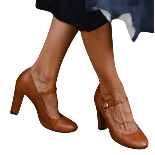 Disse vakre Mary Jane-pumpsene gir et stilig og feminint preg til ethvert antrekk. Med sin varme konjakkfarge, elegante runde tå og delikate ankelstropp utstråler de ren klasse. Den robuste blokkhælen gir ikke bare et elegant utseende, men også stabilitet og komfort, slik at du kan gå uanstrengt hele dagen eller natten.