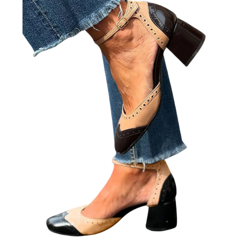 Legg til et snev av retro-sjarm til antrekket ditt med disse vakre Vintage Two-Tone Mary Jane Pumps. Disse skoene kombinerer en klassisk beige base med elegante mørkebrune og svarte detaljer for et raffinert, tidløst utseende. De subtile brogue-aksentene og den avrundede tåen skaper et unikt, feminint utseende.