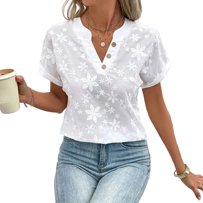 Blusen har en flatterende V-hals med knappedetalj, noe som skaper et lekent og moderne utseende. Det delikate blomsterbroderiet gir et romantisk preg, mens de korte ermene med oppbrettede mansjetter sikrer en avslappet og komfortabel passform. Det lette, pustende stoffet føles mykt mot huden og er behagelig å ha på seg, selv på varmere dager.