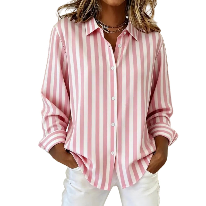 Denne rosa stripete blusen er den perfekte blandingen av eleganse og avslappet komfort. Den myke fargekombinasjonen og de klassiske vertikale stripene skaper et friskt, feminint utseende som uanstrengt komplementerer ethvert antrekk.
