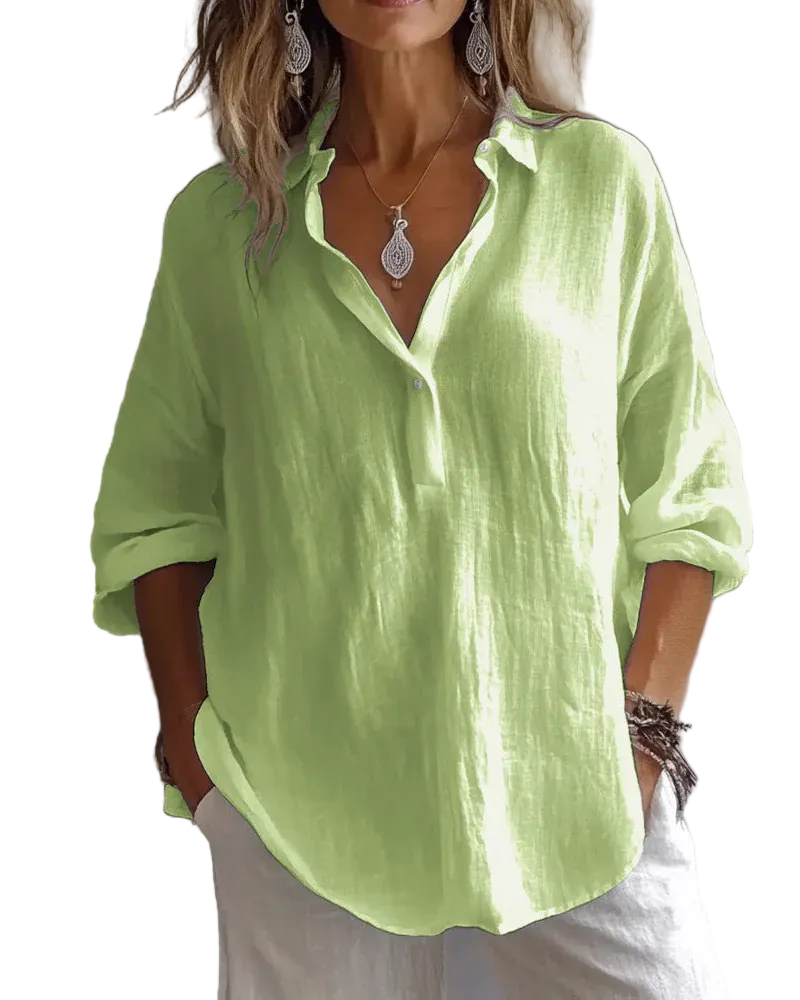 Blusen har en klassisk krage og en diskré knappelukking, noe som skaper et tidløst utseende. Det lett krøllete linutseendet gir den en avslappet og trendy følelse, noe som gjør den ideell for varme dager. Opprullbare ermer gir et avslappet preg og ekstra komfort.