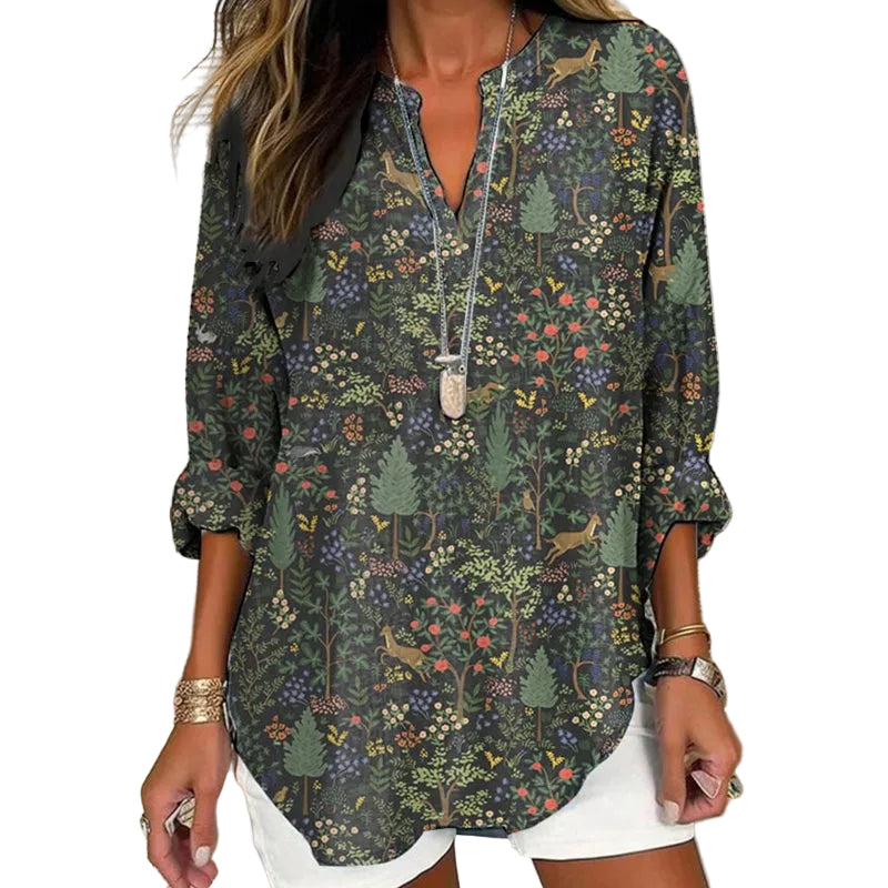 Få et snev av natur inn i garderoben din med denne stilige blusen med botanisk trykk. Det unike designet med subtile skogmotiver, dyr og blomster gir skjorten et lekent og elegant utseende. De dype grønntonene skaper et varmt, naturlig utseende som er perfekt for enhver årstid.