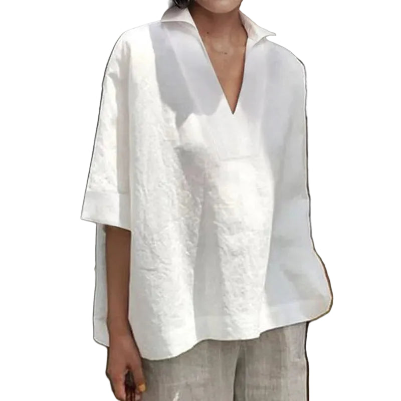 Denne minimalistiske blusen utstråler ren enkelhet og raffinement. Det luftige designet med løs passform og diskret V-hals med krage skaper et moderne, avslappet utseende som ser uanstrengt elegant ut. Den myke hvite fargen gir skjorten et friskt, tidløst utseende som passer perfekt til ethvert antrekk.