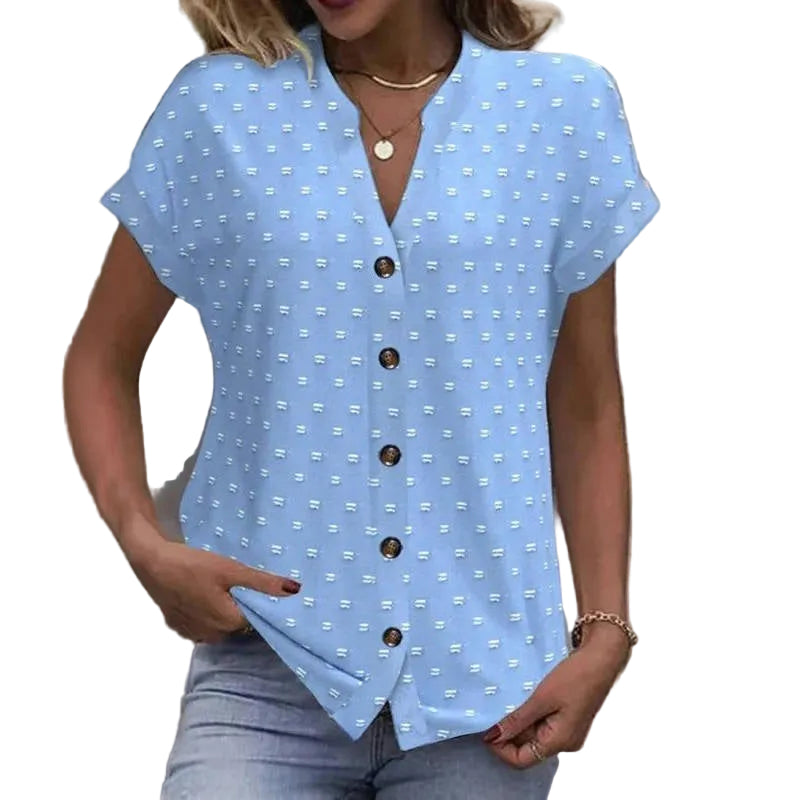 Denne friske, myke blå blusen er den perfekte blandingen av komfort og stil. Det subtile prikkete mønsteret gir skjorten et lekent og feminint utseende, mens den klassiske knappelukkingen skaper et tidløst utseende. Ideell for både uformelle og formelle antrekk.
